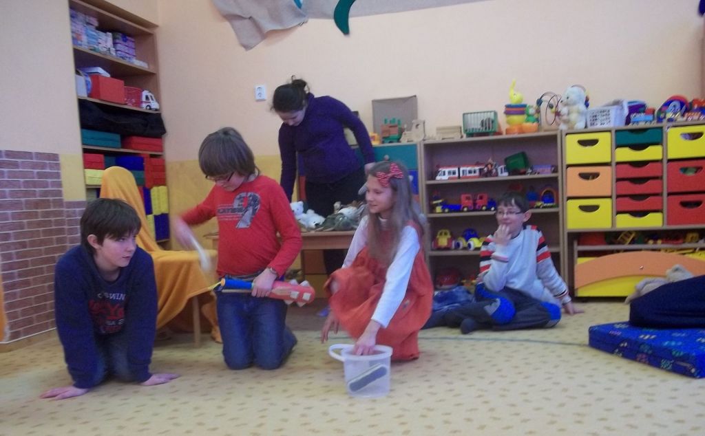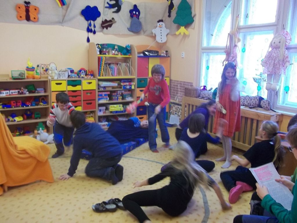 Připravili jsme si celkem tři příběhy, které jsme uvedli melodií ze známého večerníčku, zahranou na housle a flétnu. Děti hned poznaly, o jakou pohádku se jedná, a tak jsme mohli začít číst první vyprávění o tom, jak Mach a Šebestová dostali kouzelné sluchátko. Děti z MŠ nejen pozorně poslouchaly, ale pomohly nám i mňoukat, když Mach se Šebestovou poprosili kouzelné sluchátko o milión koček, a dokonce si s námi i zazpívaly. U druhého příběhu pak držely palce Machovi a Šebestové, kteří tentokrát bojovali proti bacilům v Kropáčkově puse, aby se s nimi mohl vydat na výlet do ZOO. Jejich bitva byla úspěšná, a tak jsme si mohli zazpívat písničku Umím prase zepředu, při které naše třída využila netradiční hudební nástroje – kazu a guiro. Jak už asi tušíte, poslední vyprávění bylo o tom, jak jela celá 3. B do zoologické zahrady, a protože i tento příběh nakonec dopadl dobře, mohli jsme si všichni naposled společně zazpívat písničku Mach a Šebestová.